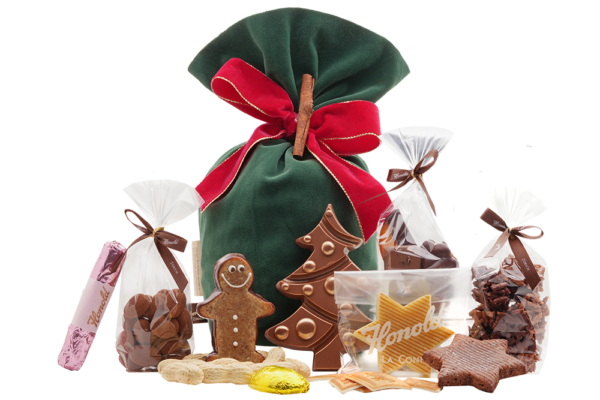 Santa Claus bags made of green velvet, which are sewn at the “Marketlücke Zürich”, filled with the following Honold delicacies: