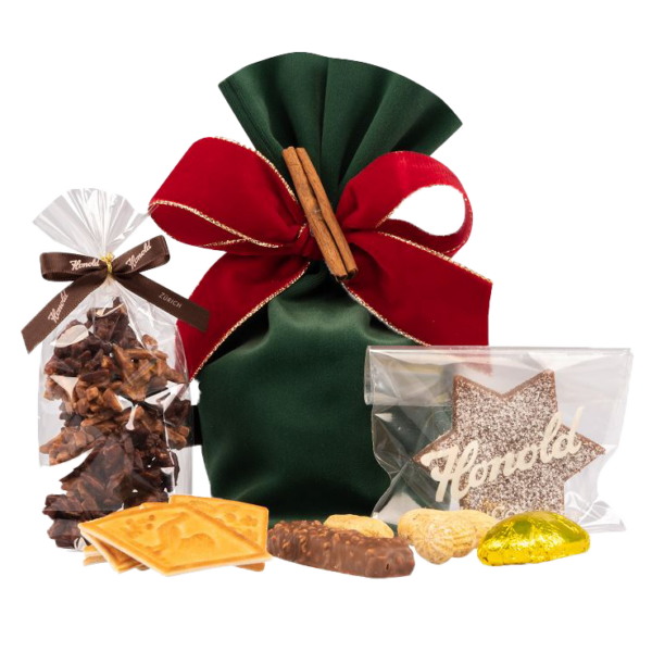 Santa Claus bags made of green velvet, which are sewn at the “Marktlücke Zürich”, filled with the following Honold delicacies: