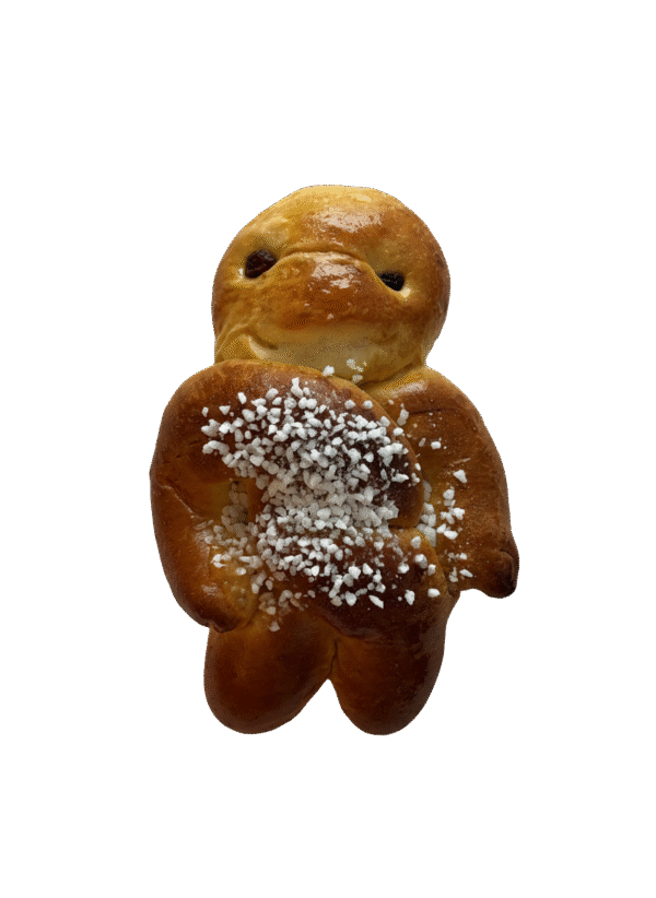 Every day, our bakers shape Grittibänzen from sweet dough and decorate them classically with hail sugar and sultanas as eyes.