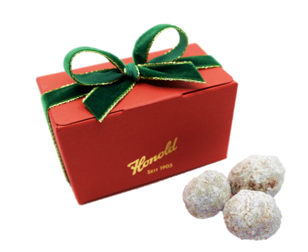 This traditional Honold recipe is made with whole Regina grapes, which are soaked in cognac for a year and then coated with Chakra Noir 70% and icing sugar.