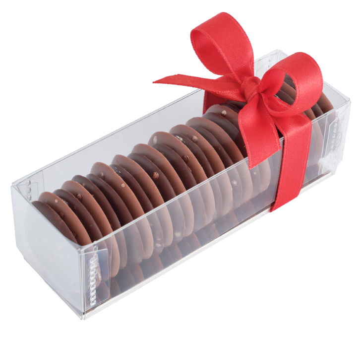 The new delicately filled dark Christmas jetons are coated in Chakra Noir 70% and infused with intense caramel, honey, and ginger. Their lighter counterpart, made with Chakra Lait 40%, delights with festive cinnamon caramel.