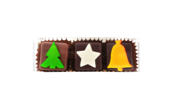 Delicious pralines made of Chakra Noir 70% or Chakra Lait 40% decorated with Christmas motifs.