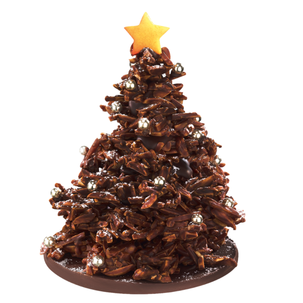 Covered with icing sugar snow and Grand Cru Charka Noir 70% slivered almonds, the Rocher Christmas tree awakens anticipation for Christmas.