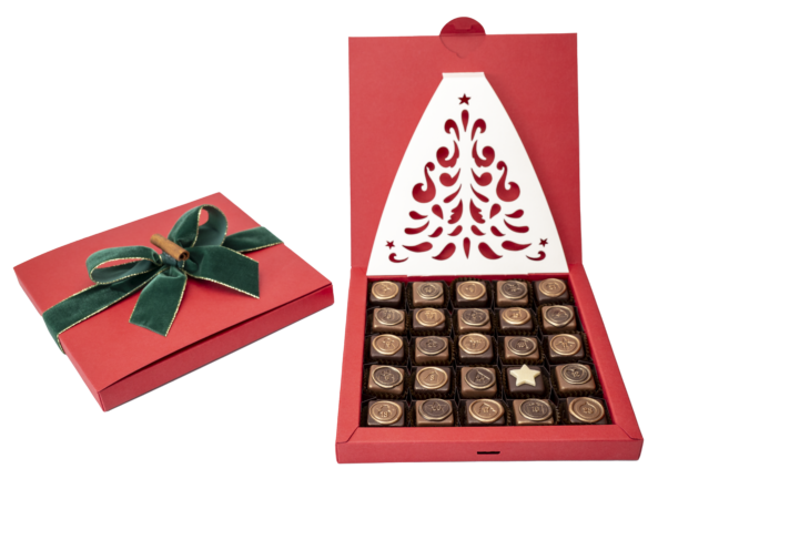 The beautiful gift box contains a festively created praline for each day of Advent with different flavors and designs. The Advent calendar is 100% recyclable and produced entirely in Switzerland.