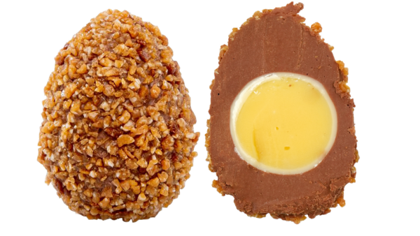 Das Scotch Egg als süsse Variante. Zart schmelzende Gianduja umhüllt einen gelben Kern aus passionsfruchtganache, gedreht in Nougat-Croquant.