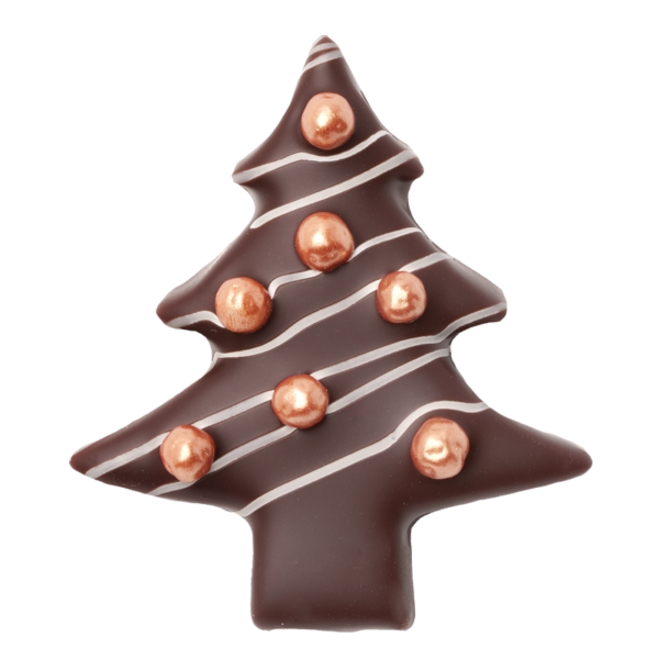 Haselnuss-Gianduja ist umhüllt von knackiger Grand Cru Chakra 70% Schokolade und wird als Tännli mit weisser Schokolade und Crisp-Pearls dekoriert.